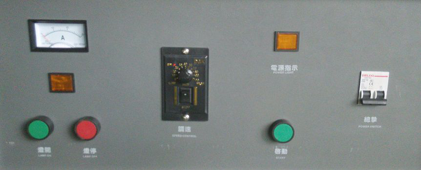 控制面板上有:設備總開關、電源指示燈、啟動按鈕、調速器、燈開燈按鈕、關